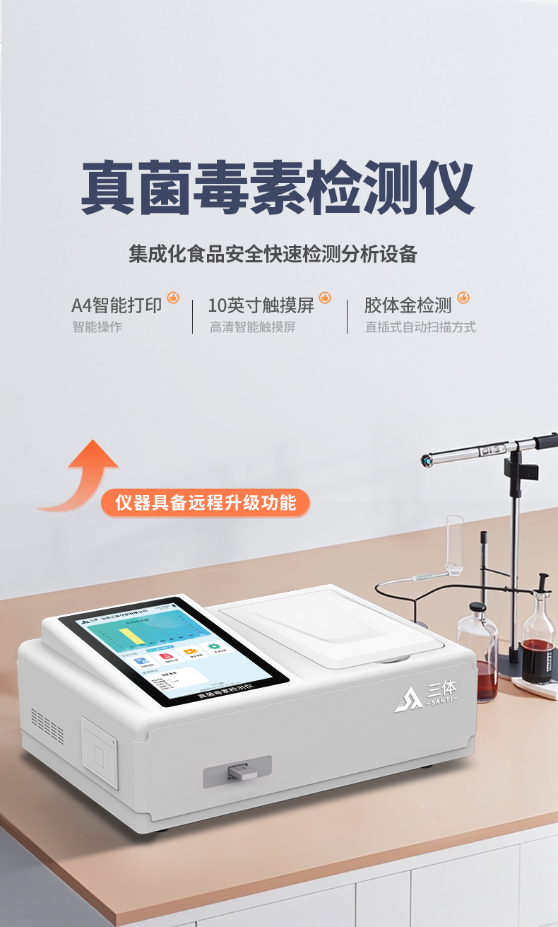 山東三體儀器有限公司生產(chǎn)的真菌毒素檢測儀應用競爭抑制免疫層析的技術(shù)原理,通過就是通過待檢測物與抗體結(jié)合的方法,分析待檢樣品中真菌毒素殘留??煽焖贆z測糧食、飼料、谷物、食用油、調(diào)味品中如玉米、大米、小麥、大麥、糙米、麩皮、稻谷、豆粕、米糠、飼料中的黃曲霉毒素B1、M1、總量,玉米赤霉烯酮、嘔吐毒素、T2毒素、赭曲霉毒素、伏馬毒素等。