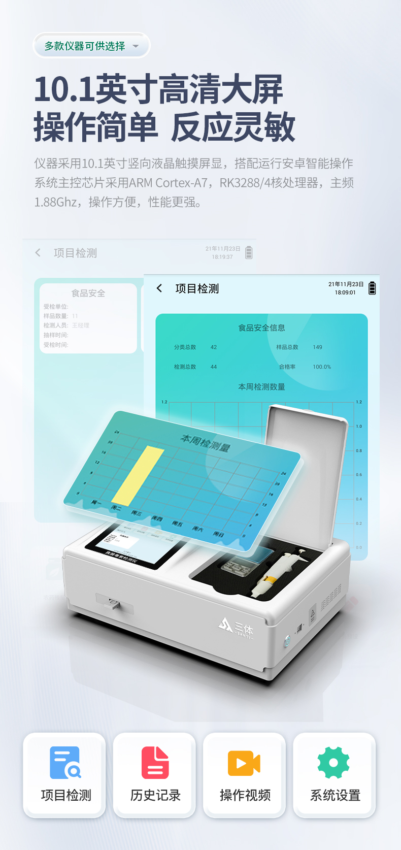 1、儀器采用10.1英寸液晶觸摸屏顯,搭配運行安卓智能操作系統(tǒng),主控芯片采用ARM Cortex-A7,RK3288/4核處理器,主頻1.88Ghz,運轉(zhuǎn)速度更快速,性能更強。