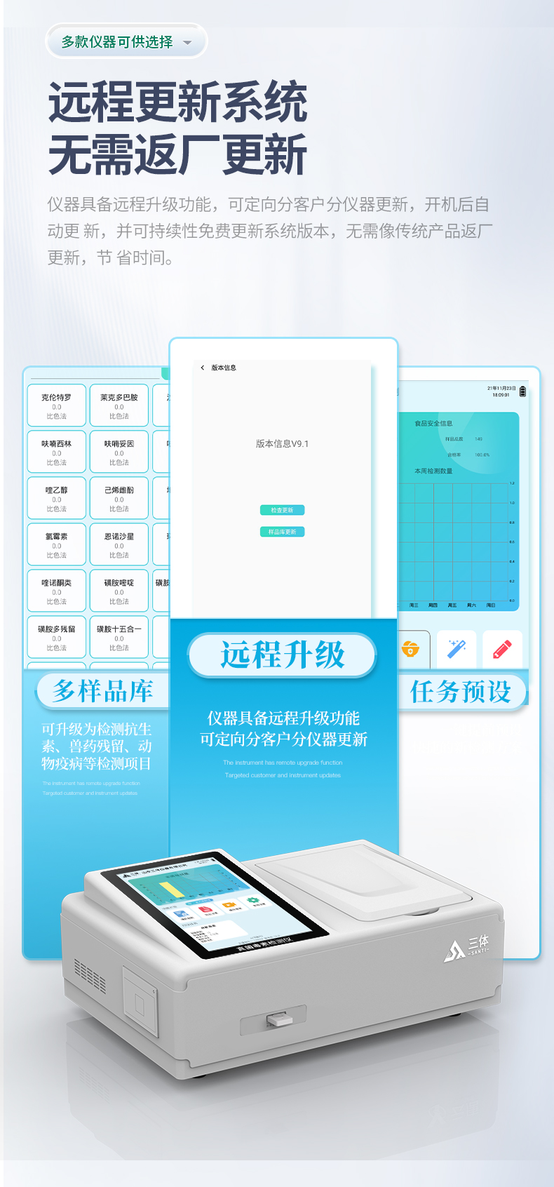 13、儀器具備遠程升級功能,可定向分客戶分儀器更新,開機后自動更新,并可持續(xù)性免費更新系統(tǒng)版本,無需像傳統(tǒng)產(chǎn)品返廠更新,節(jié)省時間及人力成本并避免了物流運輸返廠升級導致設備損壞的潛在風險。
