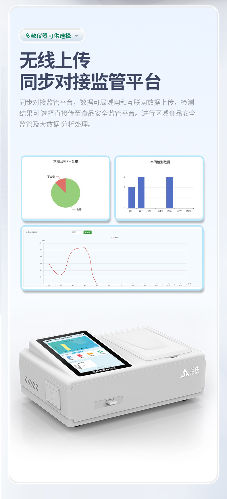 11、儀器具有 wifi 聯(lián)網(wǎng)上傳、RJ45網(wǎng)線連接功能,可以快速上傳數(shù)據(jù)。同步對接監(jiān)管平臺,數(shù)據(jù)可局域網(wǎng)和互聯(lián)網(wǎng)數(shù)據(jù)上傳,檢測結(jié)果直接傳至食品安全監(jiān)管平臺。進行區(qū)域食品安全監(jiān)管及大數(shù)據(jù)分析處理與數(shù)據(jù)統(tǒng)計,檢測區(qū)域食品安全長短期動態(tài),達到食品安全問題預估、預警。