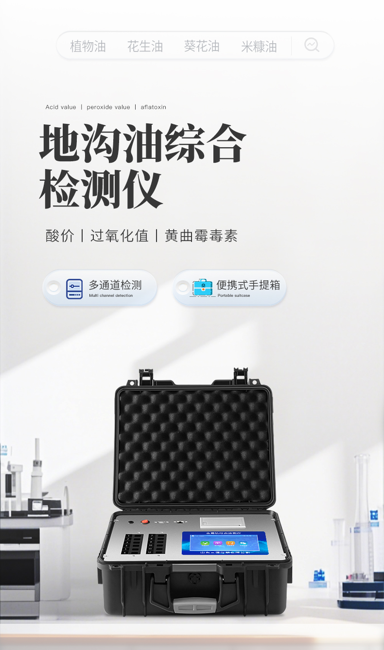 食用油安全檢測儀為集成化油品快速檢測分析設備,能夠快速檢測食用植物油、食用豬油、花生油、葵花油、米糠油、食品、肉制品中的黃曲霉毒素,苯并芘,辣椒素等含量;通過檢測可確定植物油是否符合國家標準或是否為劣質油、地溝油等。