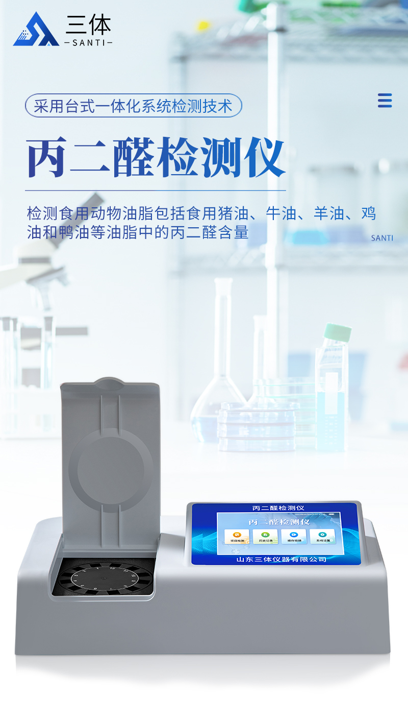 【產(chǎn)品簡介】產(chǎn)品用途:山東三體儀器有限公司生產(chǎn)的丙二醛檢測儀為集成化食品安全快速檢測分析設備,采用臺式一體化設計,能夠快速檢測食用動物油脂包括食用豬油、牛油、羊油、雞油和鴨油等油脂中的丙二醛含量;儀器預留其他項目···
